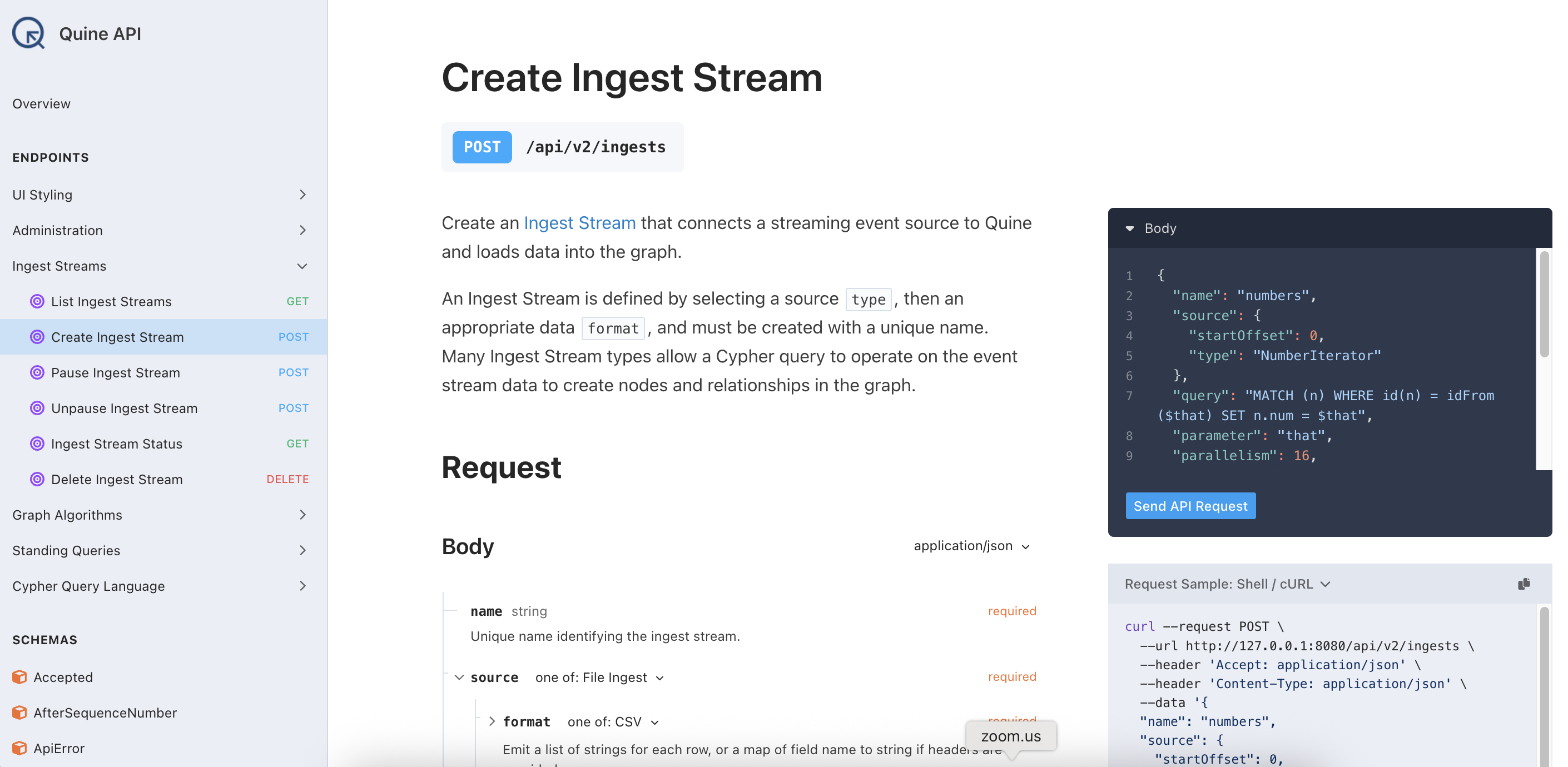 This interactive documentation also includes a detailed specification of every API, describing all optional and required values, and showing what the possible options are. In some of the API endpoints (like Standing Queries or Ingest Streams) these options can be very complicated and detailed, with many options available. All available options are shown in this "Schema" section.