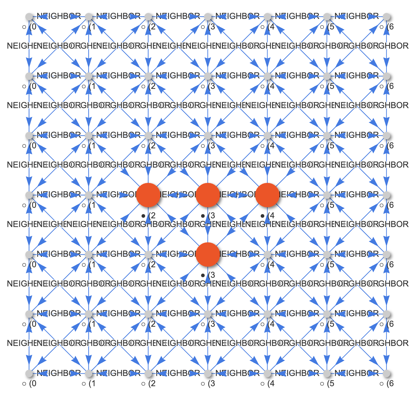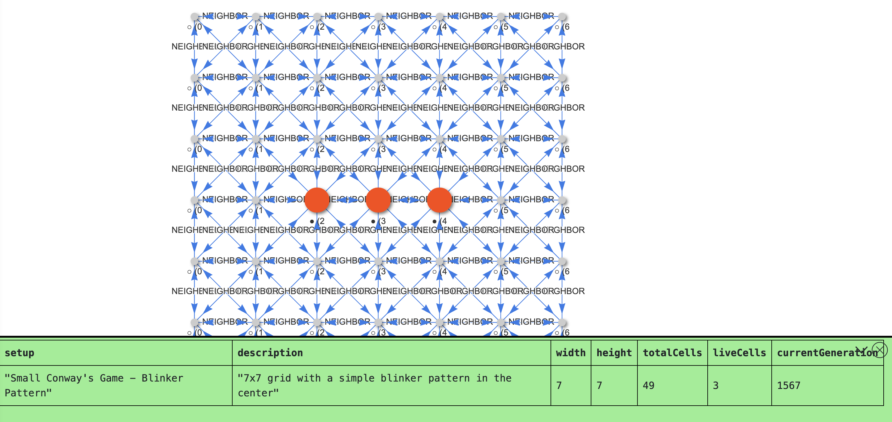 x,y,alive,generation, andstate - Cells are connected via