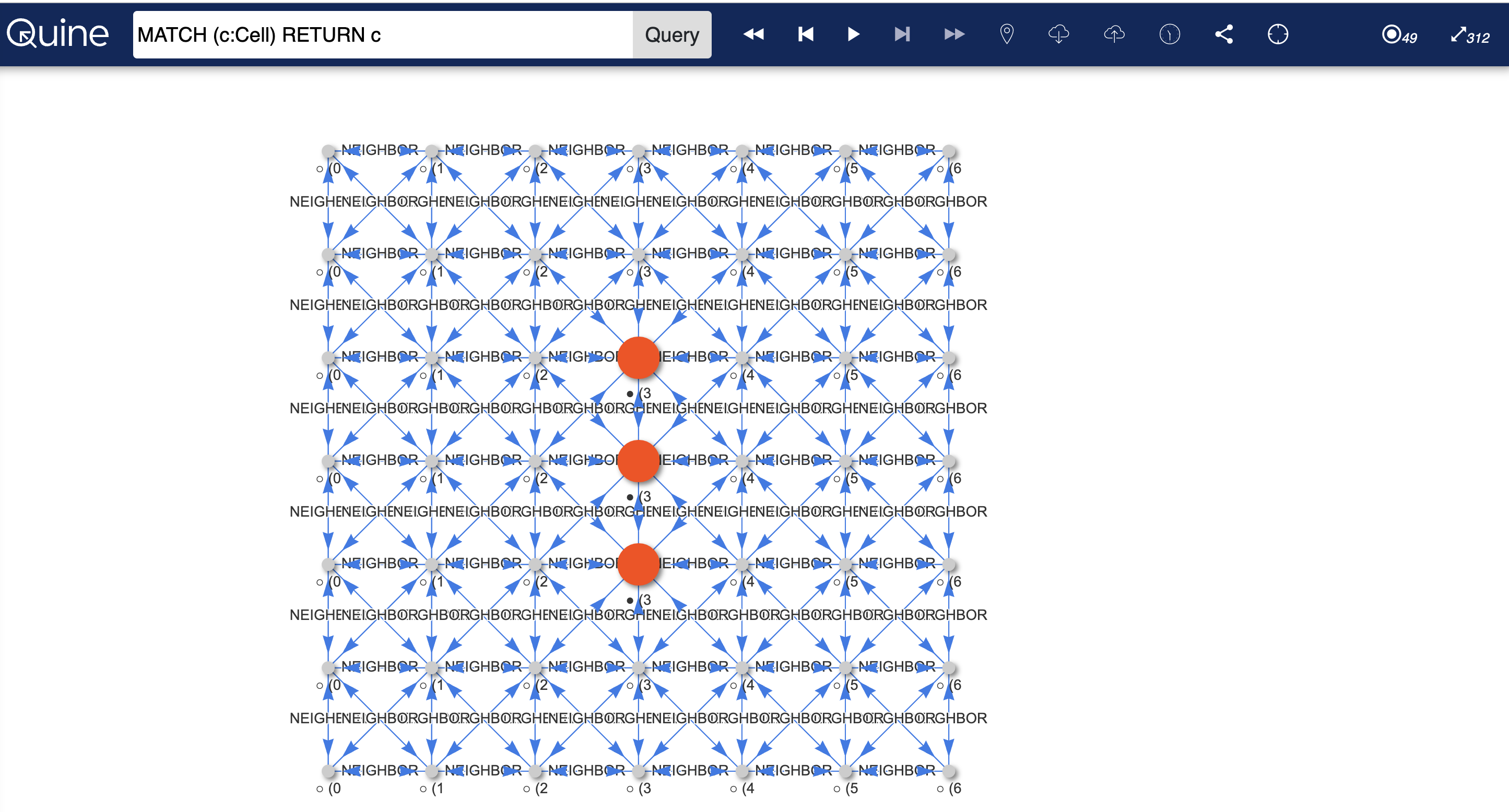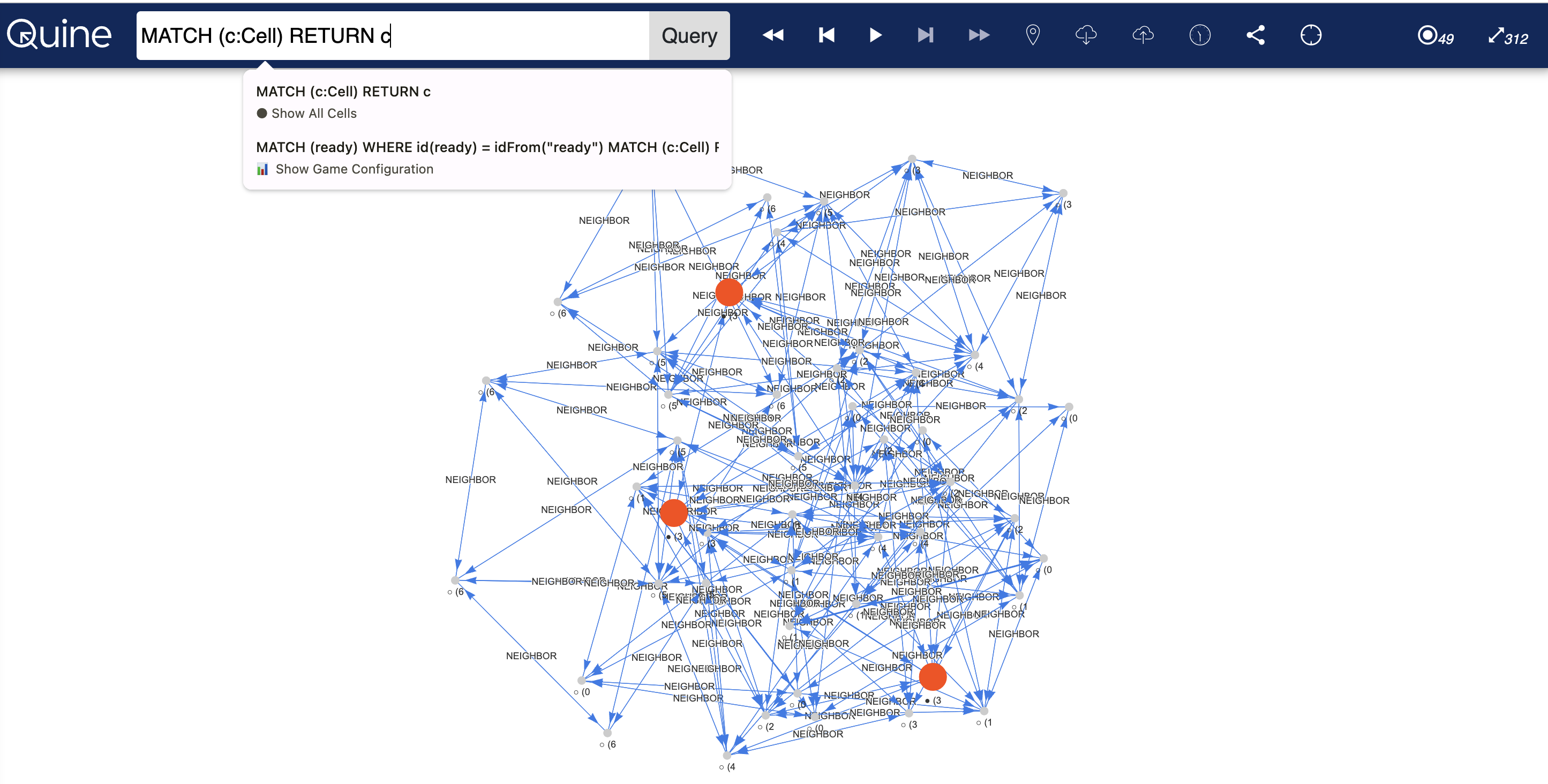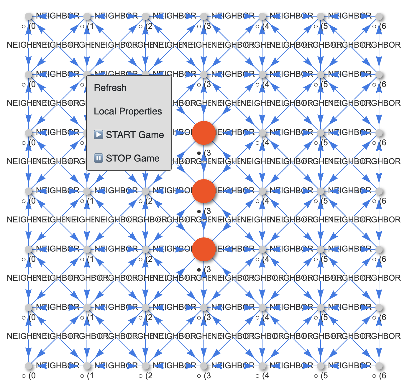 [:NEIGHBOR]relationships to their 8 adjacent cells - A central ready node coordinates the computation waves and tracks the current generation